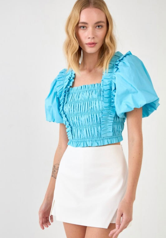 Blue Smocked Puff Sleeve Top
