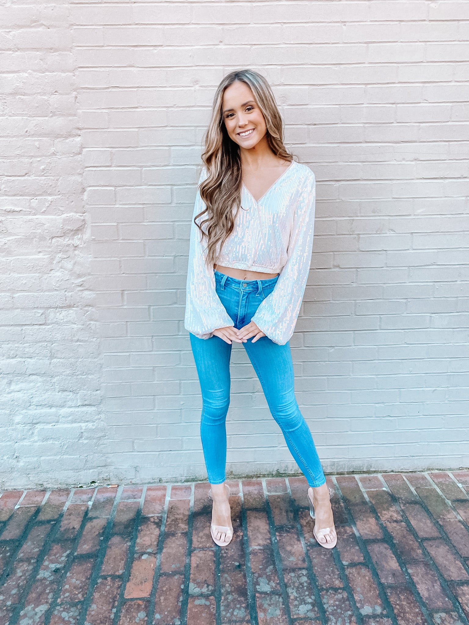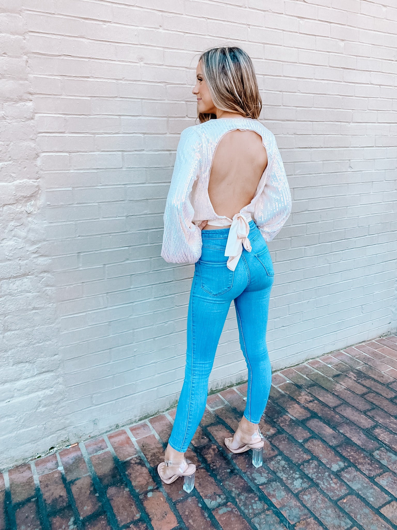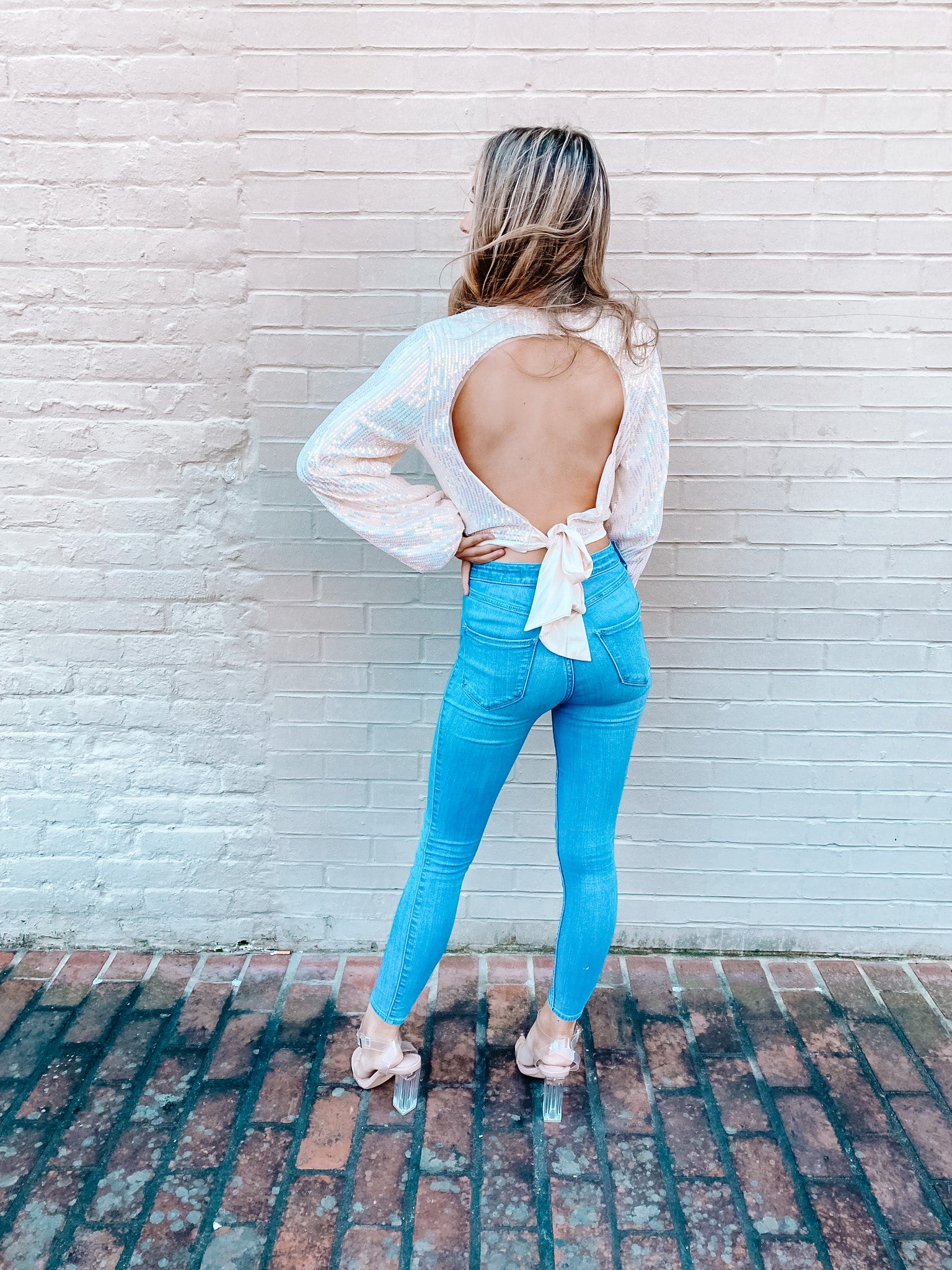 Long sleeve V-neck sequin crop top. It has an open back that ties so it is adjustable!
